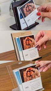 Frente e verso da placa personalizados com as suas fotos favoritas — assim, cada mês do ano vem acompanhado de boas lembranças.