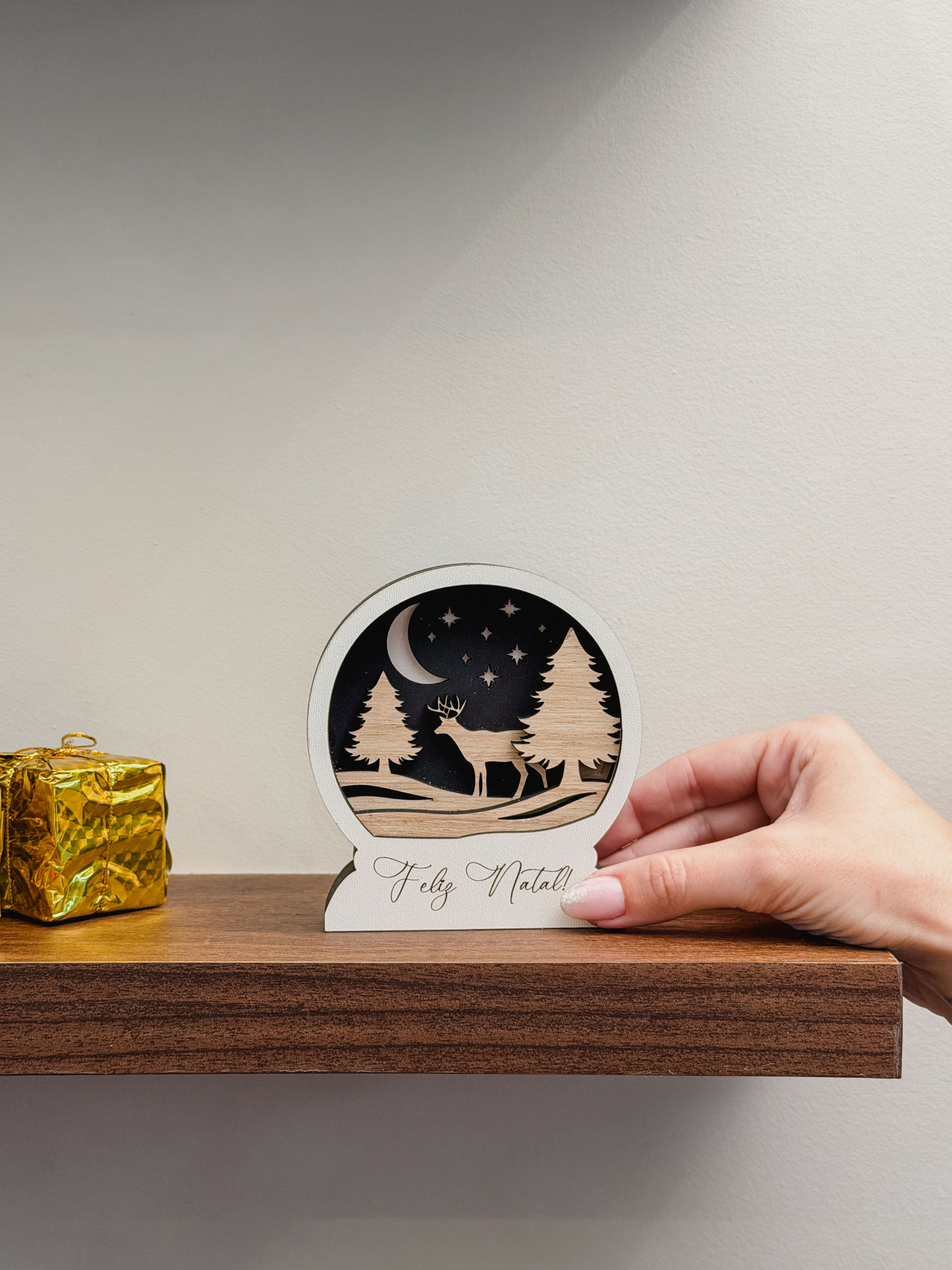 O Globo de Neve “Feliz Natal” é produzido em madeira, com design delicado e acabamento que remete ao aconchego das festas de fim de ano. Ideal para decorar mesas, aparadores ou estantes, trazendo um toque natalino encantador e repleto de afeto para o seu lar.