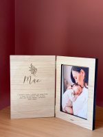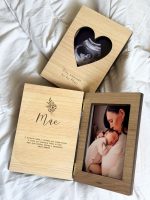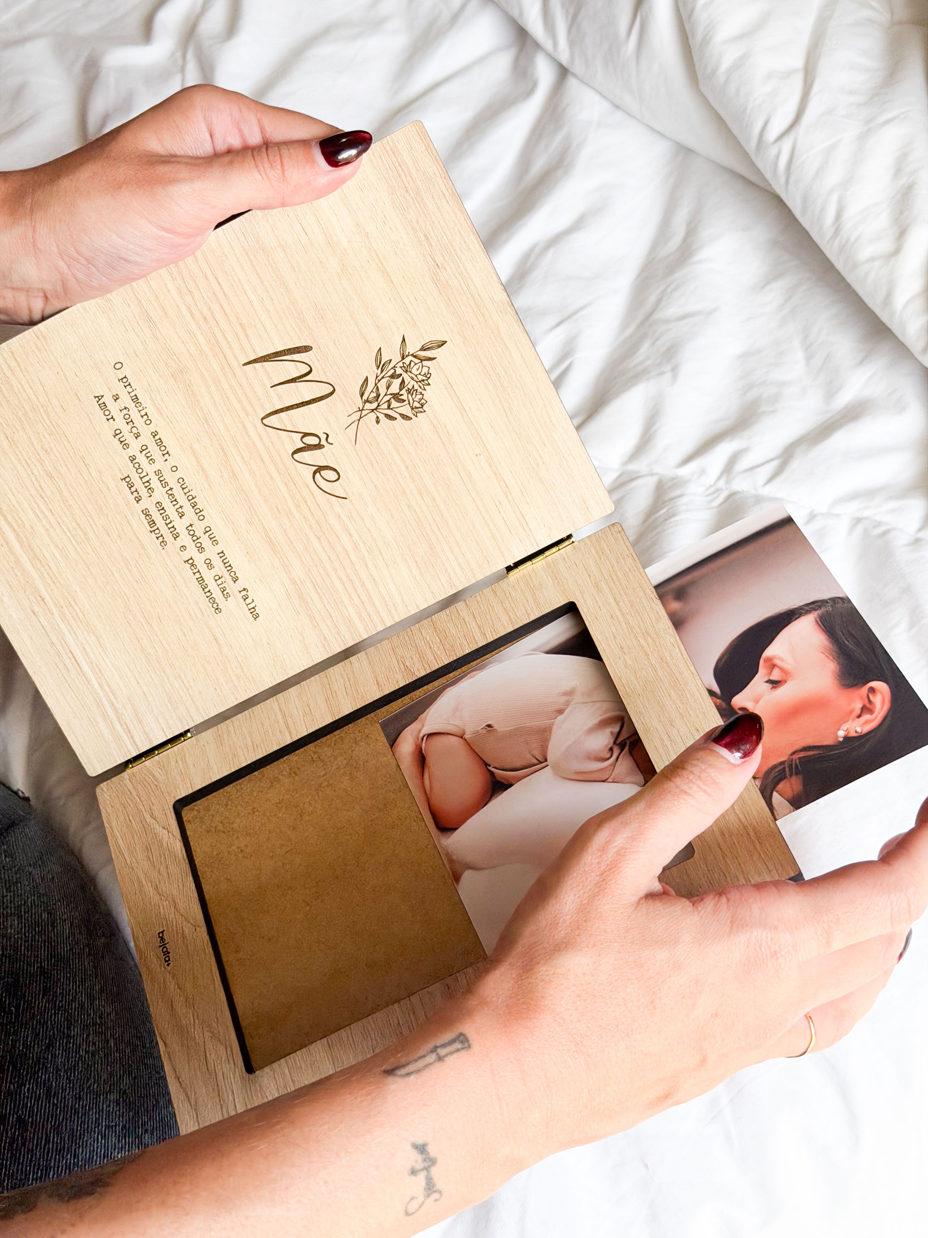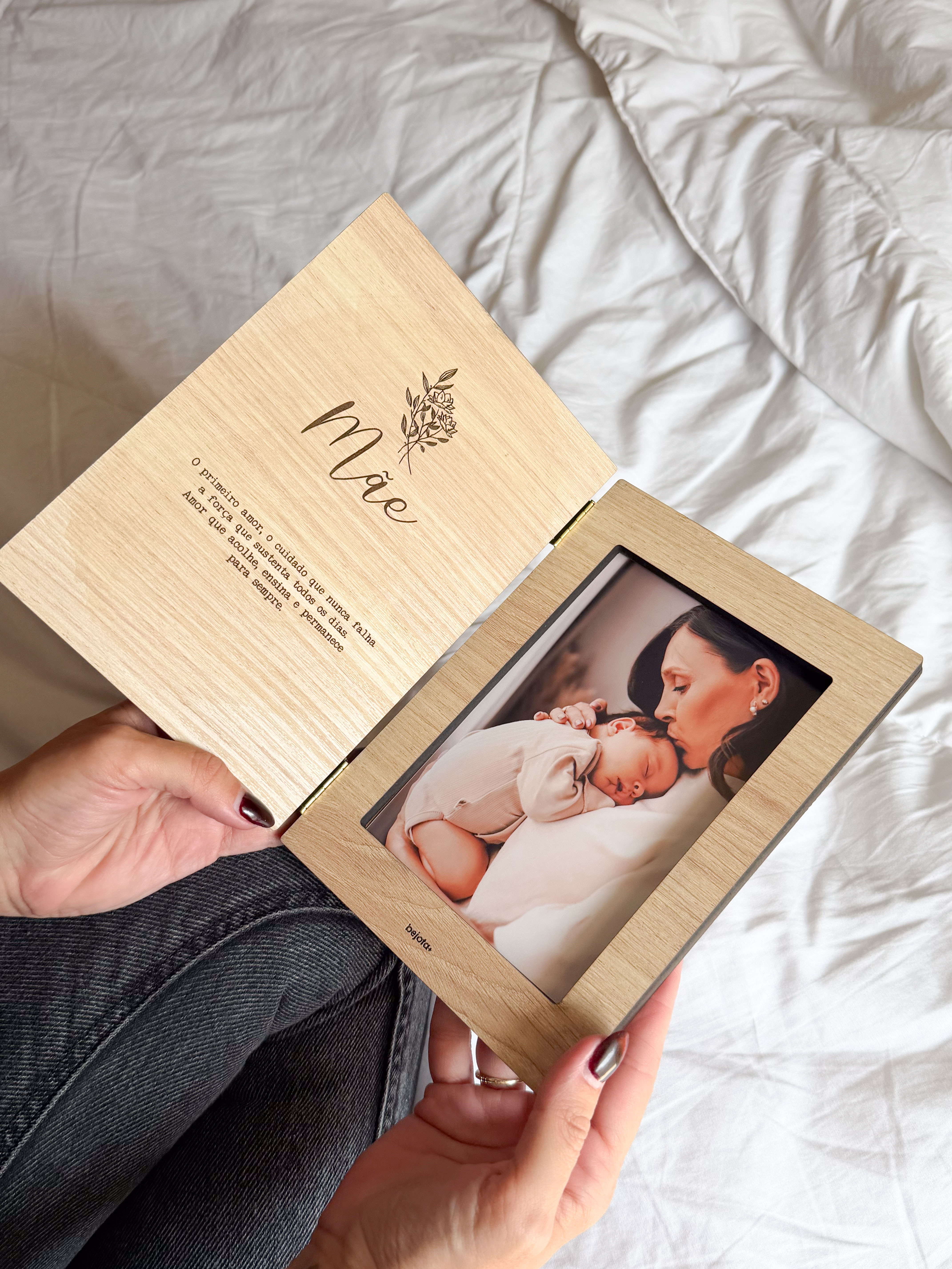 Produzido em madeira Carvalho Treviso, a peça traz a palavra “Mãe” em destaque, criando um design delicado e atemporal que valoriza ainda mais a foto escolhida.